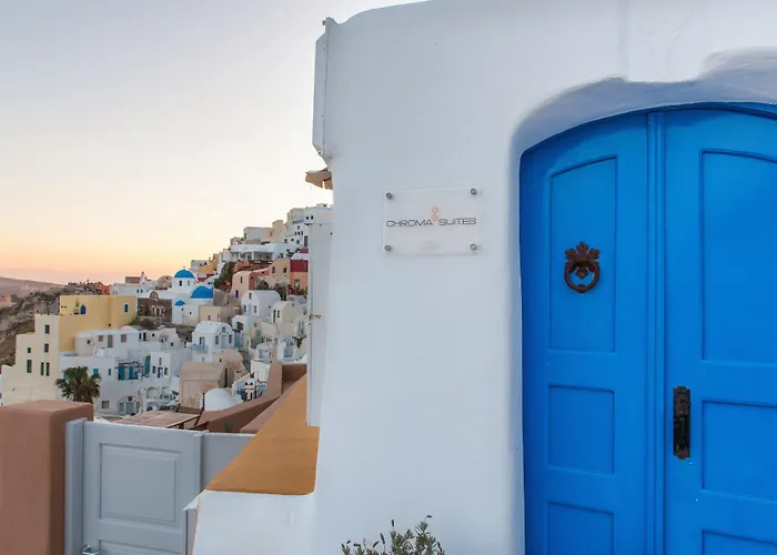 Chroma Suites ligger i Oia 1 km fra byens centrum og tilbyder Wi Fi på værelserne. Hovedseværdigheder i Oia, såsom Søfartsmuseet og Santorini Folkloremuseum er placeret i nærheden.